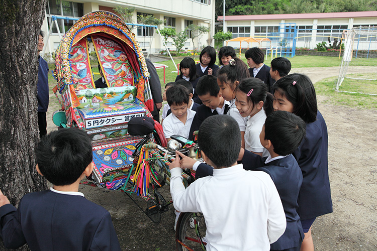 種子島中部にある納官小学校は生徒数19人の小さな学校だ。この小学校の全校集会(といっても19人しかいないわけだが)に呼ばれて話をすることになったのは、朝たまたまリキシャで学校の前を通りかかったときに、校長先生と出会ったからだった。僕のリキシャをおもしろがってくれた松尾校長が「ぜひ子供たちにも見せてあげたいな」と言って学校の中に誘ってくれたのだ。